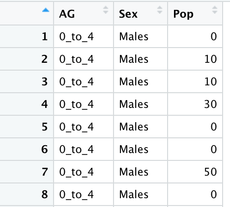 If we do not fix the order, the grouped data set may be sorted wrongly based on numerical order of the first digit of the age group, in this case, age group 5-9 would come after 45-49 as initial digit ‘5’ comes after ‘4’.