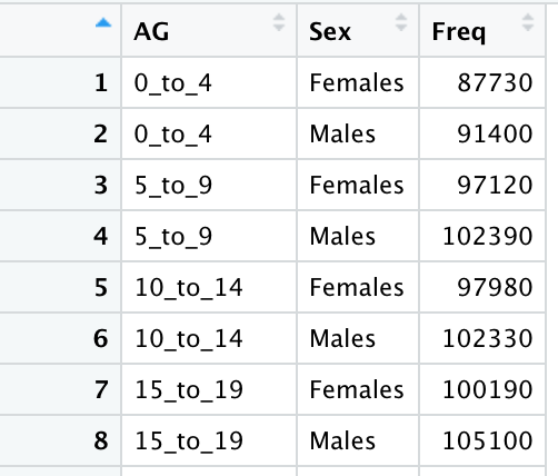 After examining the imported data, we found out that to plot a age-sex pyramind, we only need values from 3 columns: age group, sex, and count of population within the age group and sex. So we use select() to create a new dataframe using only these relevant columns.