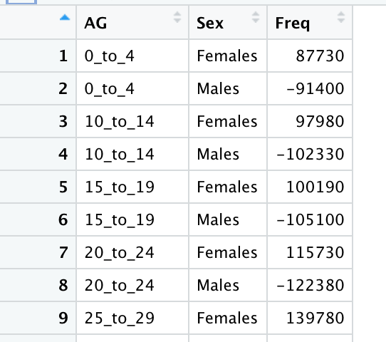 In order to plot a back-to-back bar chart as indicated in the population pyramid, the last step of data preparation is that we need to use mutate() function and ‘if_else’ to modify values in the ‘Freq’ column by changing the signals of males (+) and females (-). This will lead to males at the right side and females at the left side of the plot.