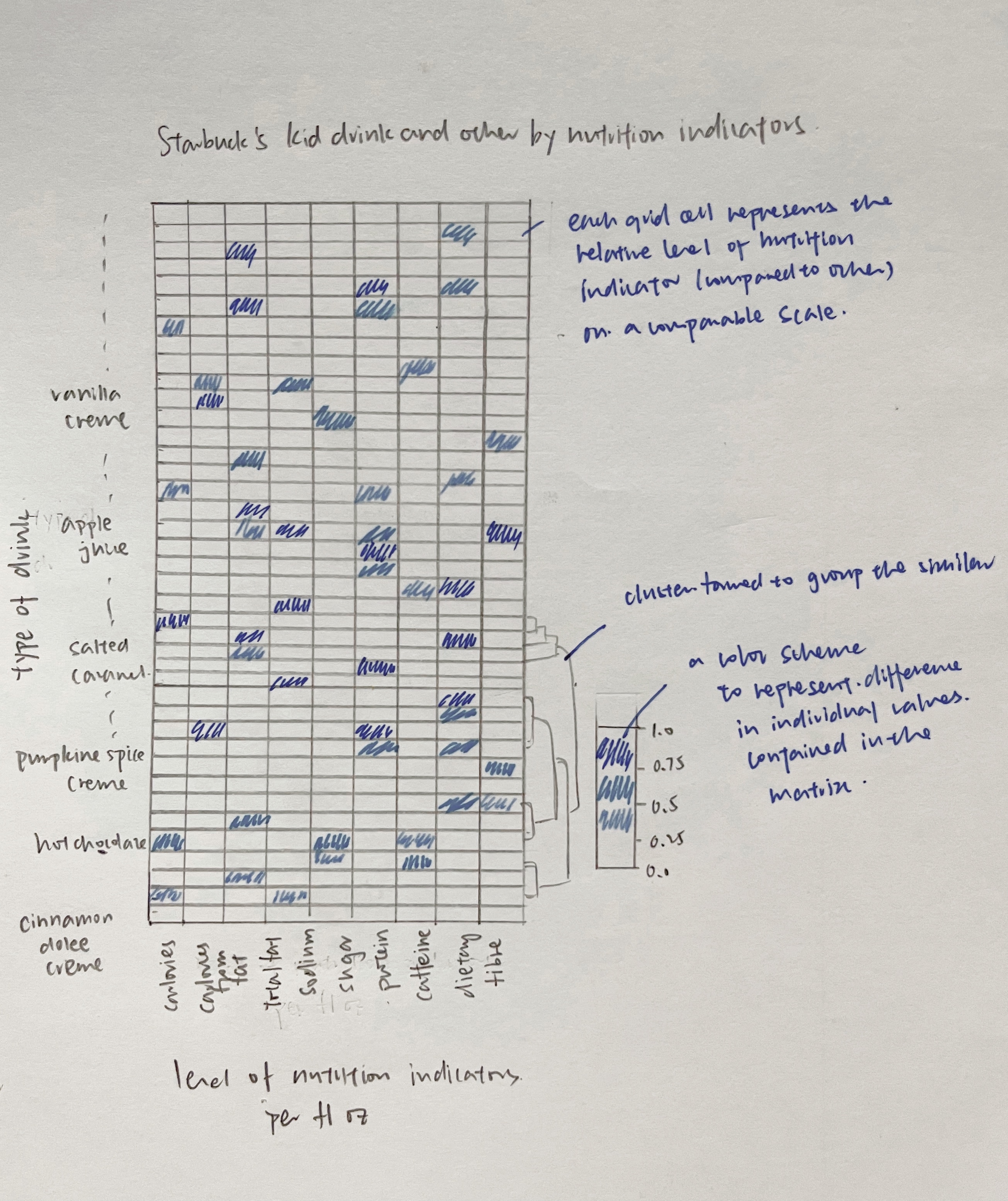 For this exercise, the data set used is starbucks_drink.csv. In order to segment “the kid drink and other” by nutrition indicators, we need to use heatmap as it would be able to perform clusterisation and do a corresponding reordering: it would calculate the distance between each pair of rows and columns and try to order them by similarity in terms of level of nutrition indicators.