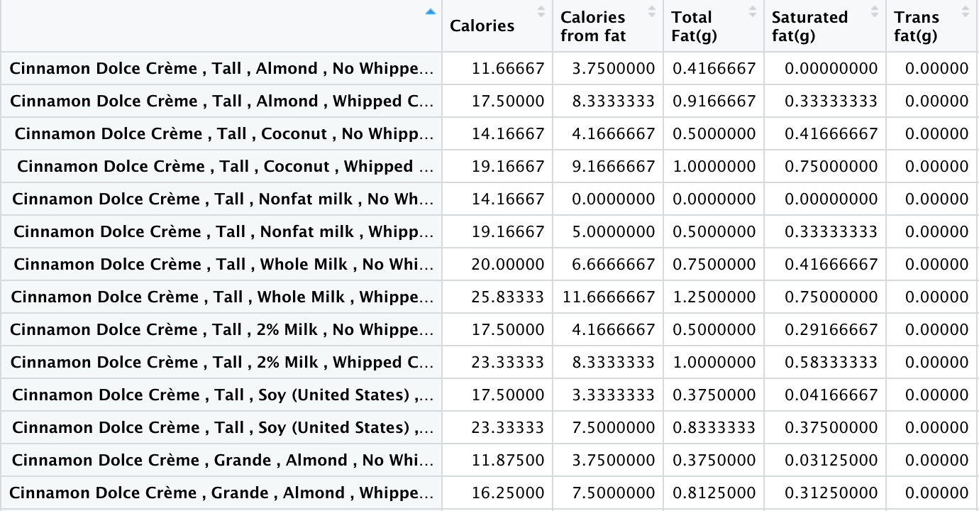It is noticeable that we could not differentiate each row of the table using ‘Name’ column alone as each type of drink comes with different sizes, choice of milk as well as the option of whether to add whipped cream. Consequently, these choices would affect the level of nutrition indicators in the drink.